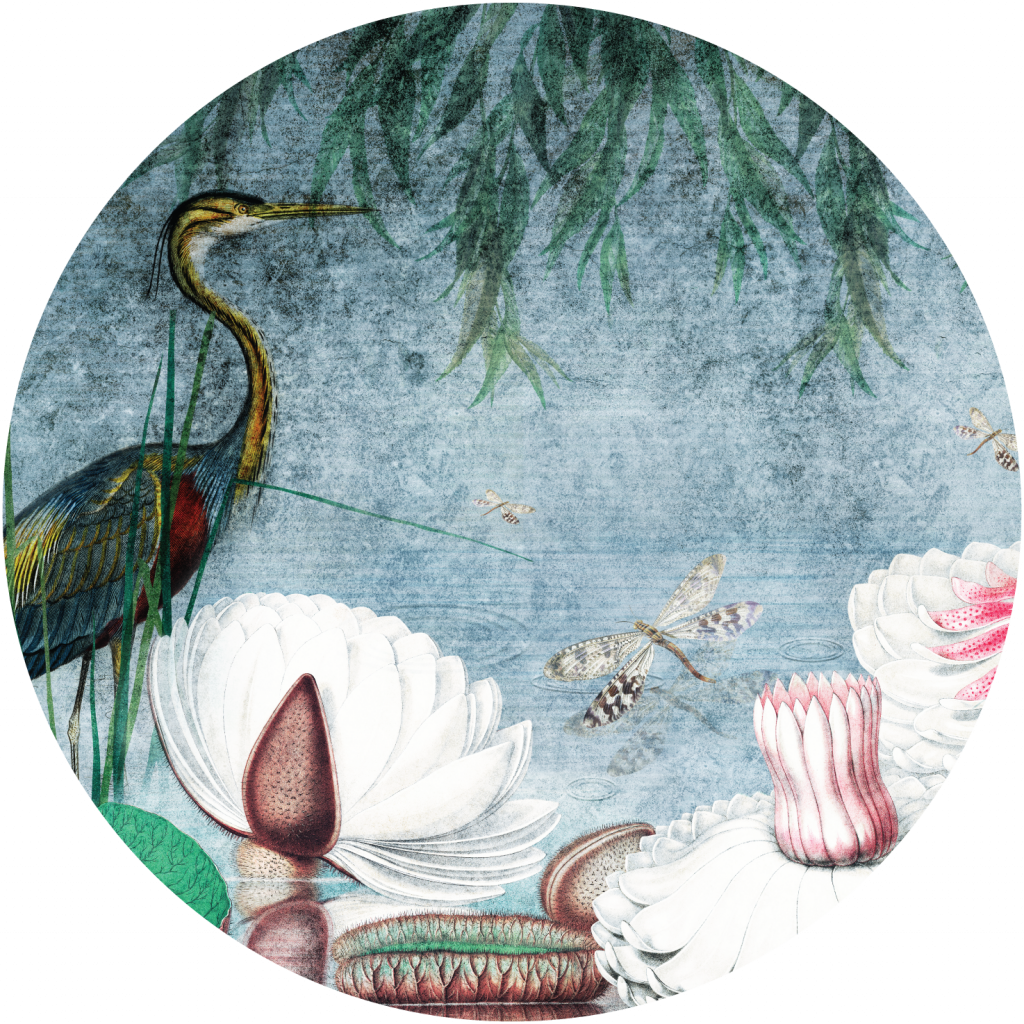 Water Lily to spokojny wzór w stylu japońskim, łączący elementy bioniczne i organiczne. Piękny żuraw, brodzący w sadzawce z liliami malowanymi w XVII wieku, do tego ważki i szum traw. Tapeta wprowadzi do wnętrza harmonię, spokój i wyciszenie.