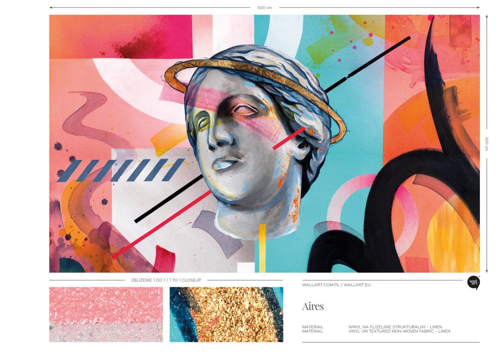 Aires to dynamiczna, soczysta kompozycja, w której centralnym punktem jest klasyczna marmurowa rzeźba głowy. Popiersie, przedstawiające klasyczne rysy twarzy, jest realistycznie odwzorowane, ale jednocześnie zintegrowane z abstrakcyjnym, kolorowym tłem. Trudno oderwać wzrok od tła Aires, pełnego różnorodnych tekstur i technik malarskich. Widać tu delikatne rozpryski farby, subtelne gradienty kolorów oraz intensywne, grube pociągnięcia pędzla, które tworzą bogatą, wielowarstwową powierzchnię. Aires to mariaż elementów klasycznej sztuki z nowoczesnym z abstrakcyjnym podejściem. Wzór jest pełen energii i życia, dzięki czemu przyciąga wzrok i skłania do dłuższego zatrzymania się nad jego detalami. Jego intensywna kolorystyka i dynamiczna forma sprawiają, że jest idealny do nowoczesnych wnętrz, gdzie może stanowić centralny punkt dekoracyjny, dodając przestrzeni artystycznego wyrazu i charakteru.