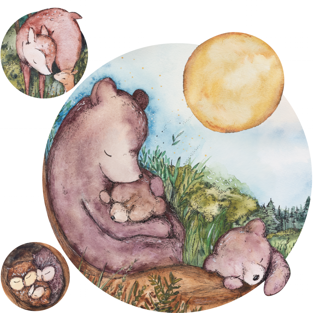 W cieniu drzew, pod drzewami misiowa rodzinka szykuje się do snu. Zamknięta kompozycja wzoru przeniesie Ciebie i Twojego malucha do świata baśni. Ciepłe, barwne kolory wzoru pozwolą na zaaranżowanie pokoju dla dziecka w każdym kolorze. Idealnie wpasuje się w nowoczesne wnętrze lub urządzone w stylu naturalnym czy boho.