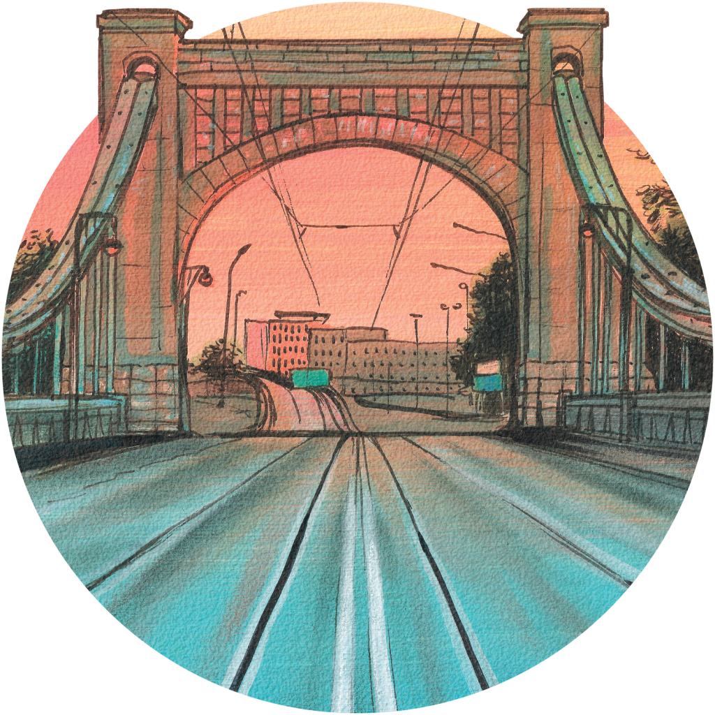 Bridge przedstawia jeden z najbardziej znanych wrocławskich mostów - Grunwaldzki. W 1904 roku ogłoszono konkurs na projekt mostu, który połączy oba brzegi rzeki w pobliżu obecnego placu Grunwaldzkiego. Do udziału w konkursie zgłoszono blisko 40 projektów, a zwyciężył koncept architekta Martina Mayera i inżyniera Roberta Weyraucha. Niegdyś zwany Kaiserbrucke czyli Most Cesarski, powstał w 1910 roku. Most powstał w dwa lata, a ważył ponad 2 tysiące ton i miał 20 metrów szerokości. Podczas próby wytrzymałościowej na moście ustawiono 24 tramwaje oraz wozy straży pożarnej.