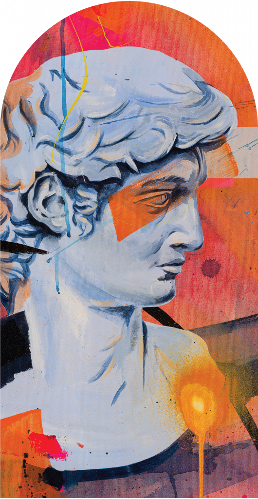 Buenos przedstawia klasyczny profil rzeźby, umieszczony w dynamicznej, abstrakcyjnej kompozycji. Centralnym elementem jest popiersie mężczyzny, którego realistyczne, starannie wyrzeźbione rysy kontrastują z tłem pełnym żywych kolorów i geometrycznych kształtów. Buenos jest zdominowane przez intensywne odcienie pomarańczu, różu, zieleni i błękitu, które tworzą energetyczną i pełną życia atmosferę. Wzór w spektakularny sposób łączy klasyczne piękno rzeźby z nowoczesnymi technikami malarskimi i żywą kolorystyką. Jego dynamiczna kompozycja i kontrastujące elementy tworzą harmonijną, choć złożoną całość, która przyciąga uwagę. Buenos doskonale nadaje się do nowoczesnych wnętrz, gdzie może stanowić główny punkt dekoracyjny, dodając przestrzeni artystycznego sznytu i energii.