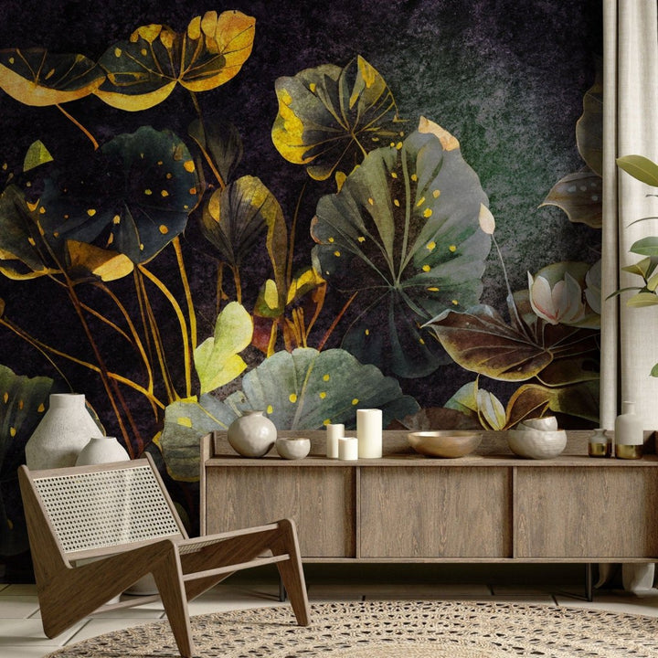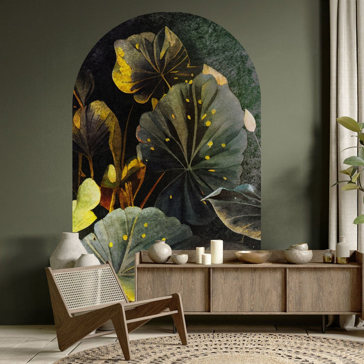 Clara to bajkowy wzór przedstawiający fantazyjny brzeg tajemniczego jeziora. Roślinność przedstawiona za pomocą głębokich, butelkowych zieleni skontrastowanych soczystą żółcią, sprawia wrażenie jakby oświetlało je ciepłe, magiczne światło. Tło ze strukturą kamienia dodatkowo podkreśla naturalny charakter wzoru.
