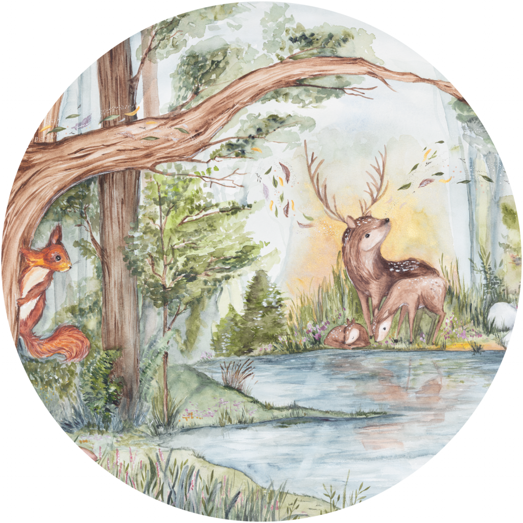 Leśna polana, pełna barwnych detali, małych leśnych zwierzątek z królem lasu - jeleniem na czele. Ciepłe, barwne kolory wzoru pozwolą na zaaranżowanie pokoju dla dziecka w każdym kolorze. Idealnie wpasuje się w nowoczesne wnętrze lub urządzone w stylu naturalnym czy boho.