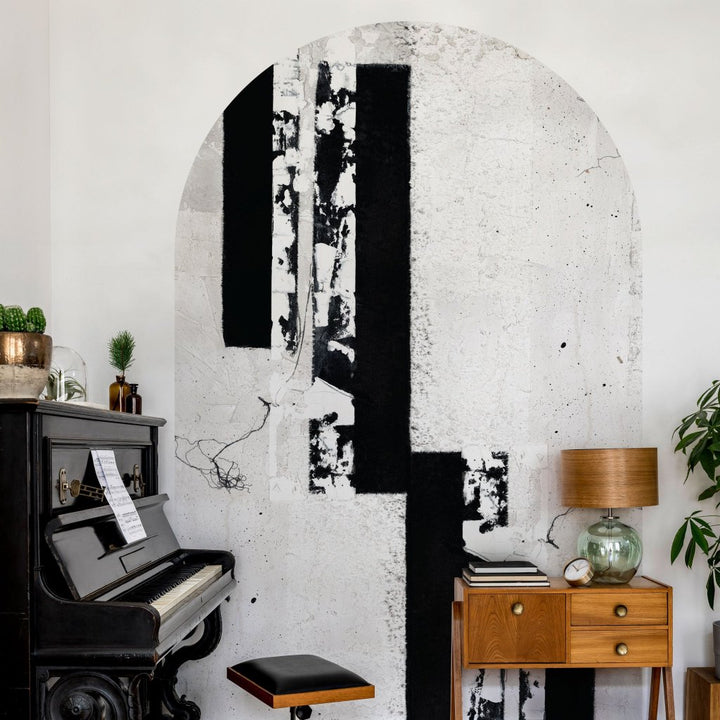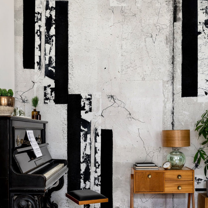 Mezzo to abstrakcyjna kompozycja z dominującymi pionowymi i poziomymi czarnymi liniami na teksturowanym tle. Mnogość odcieni bieli i szarości, z dodatkowymi elementami w postaci drobnych, nieregularnych czarnych linii i plam, nadaje Mezzo wyjątkowo elegancki, industrialny i surowy charakter. Całość stanowi złożoną, harmonijną i przemyślaną kompozycję.