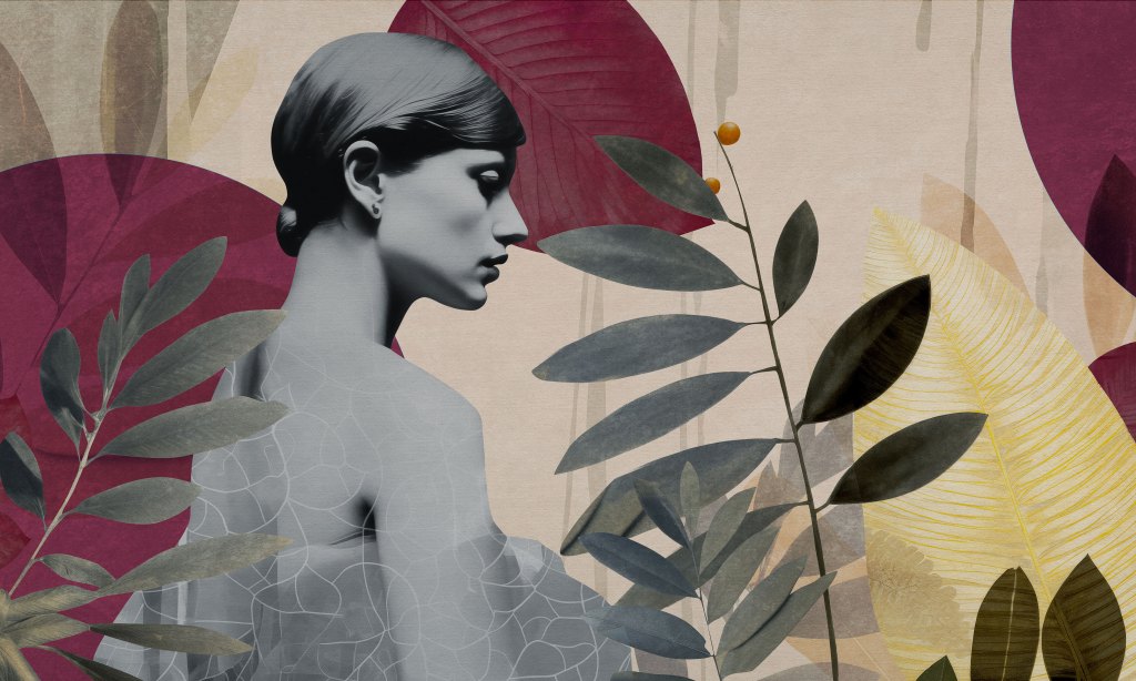 Onna Burgundy przedstawia subtelną, monochromatyczną sylwetkę kobiety otoczoną bujną roślinnością w odcieniach bordo, szarości i żółci. Tło jest stonowane, co sprawia, że centralna postać oraz rośliny wyróżniają się na pierwszym planie, tworząc harmonijną i elegancką kompozycję. Onna Burgundy doskonale nada się do wnętrz eleganckich i wyrafinowanych. Idealnie pasuje do salonu, gdzie może stanowić główny punkt dekoracyjny, przyciągając wzrok i dodając przestrzeni artystycznego charakteru. Wzór świetnie komponuje się z nowoczesnymi, minimalistycznymi aranżacjami, gdzie prostota form i kolorów jest kluczowa.