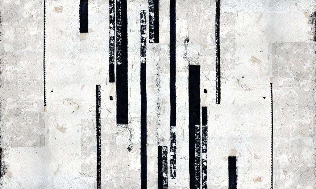 Piano to abstrakcyjna kompozycję pionowych, czarnych linii na jasnym, teksturowanym tle. Czarnobiałe elementy tworzą kontrast, nadając całości minimalistyczny, a jednocześnie dynamiczny charakter. Jasna zróżnicowana tekstura, wprowadza do obrazu subtelną głębię i złożoność.