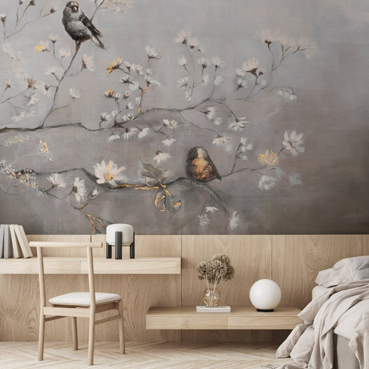 Swing jest tańcem kojarzonym z muzyką jazzową. Podobnie jak jazz, trel ptaków może nieść radość i energię, ale rownież być sentymentalny i pełen tęsknoty. Szarość obrazu Swing nadaje mu nieco tajemniczą aurę, sprzyjającą zadumie. Jednocześnie złote detale i delikatne kwiaty dodają niewinnego uroku i elegancji. Wzór łączy w sobie surowość pożądana przez miłośników minimalistycznych wnętrz, ale również nutę frywolności za sprawą elementów fauny i flory.