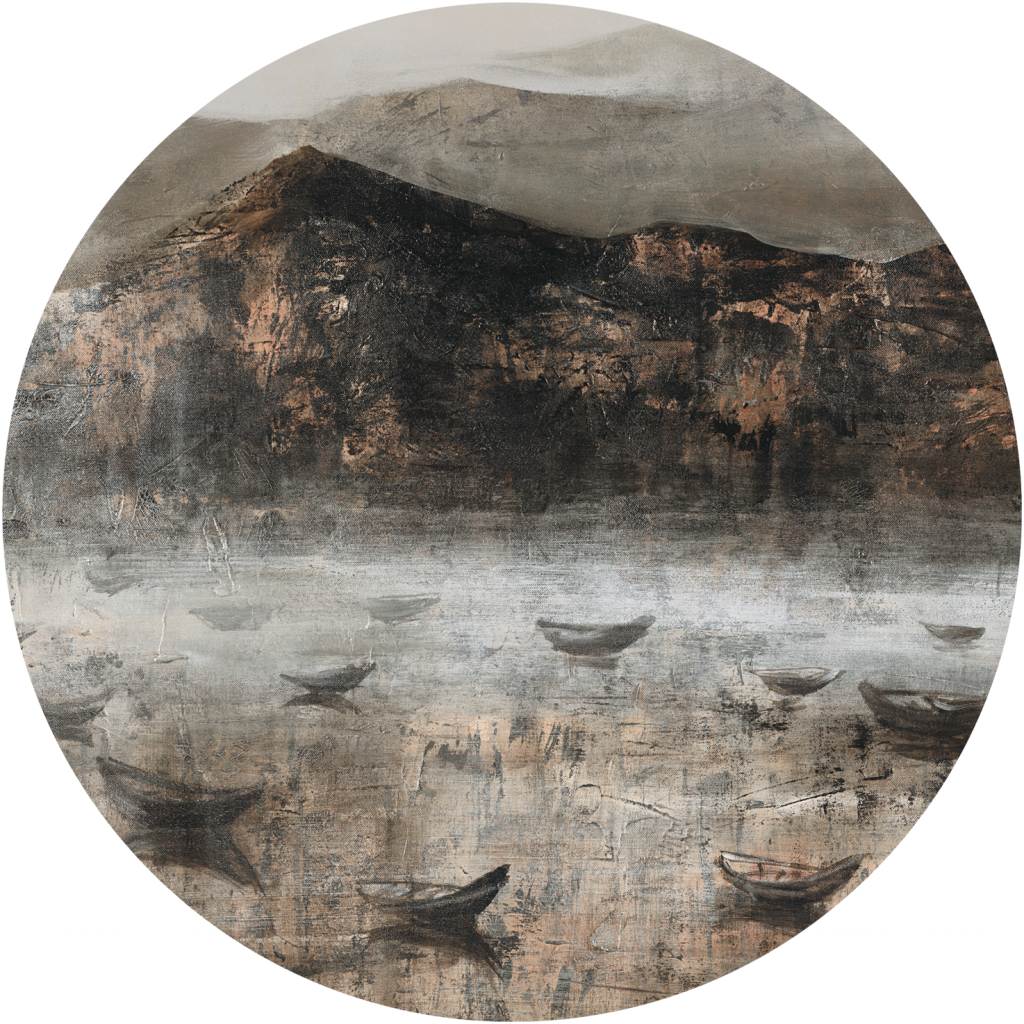 „Barca” to impresyjny pejzaż malarski przedstawiający spokojną taflę wody, po której dryfują drobne łodzie rybackie, a w tle wyłaniają się monumentalne, zamglone masywy górskie. Obraz oddaje wrażenie surowego, północnego poranka – jakby uchwycono moment ciszy przed świtem lub tuż po zmierzchu. Kompozycja jest pełna tekstur: od szorstkich, niemal fakturalnych pociągnięć pędzla, przez subtelne przejścia tonalne, aż po refleksy na wodzie, tworzące efekt delikatnego światła odbijającego się od powierzchni. Łodzie zostały ukazane w półcieniu – jak cienie zakotwiczone w przestrzeni, co nadaje wzorowi medytacyjny charakter. Ten wzór działa niemal jak obraz – opowiada historię, buduje nastrój i skłania do zatrzymania się na chwilę.