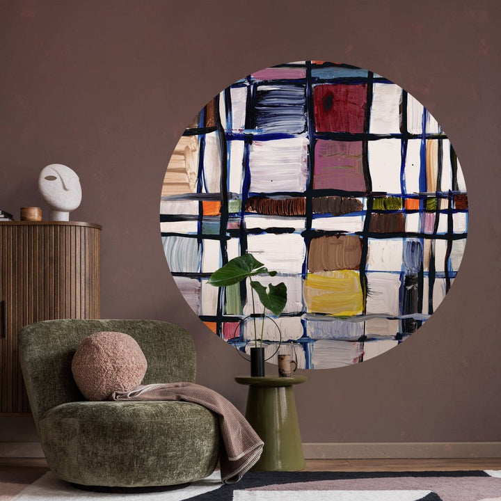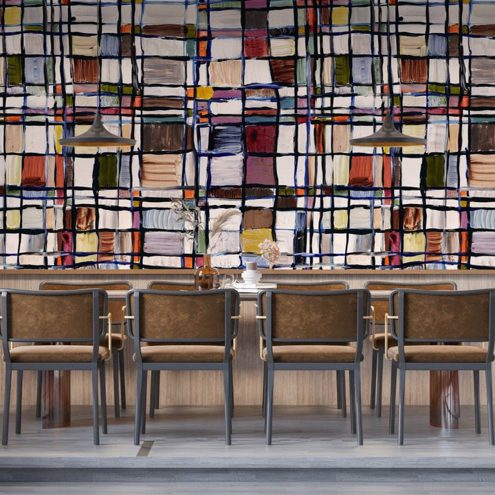 Bogata paleta barw – od czerwieni, burgundu, ochry i oranżu po zielenie, błękity, fiolety i głębokie czernie – przeplata się z neutralnymi odcieniami bieli, szarości i beżów. Takie zestawienie kolorów wprowadza do wnętrza ciepło, dynamikę i kreatywną atmosferę.