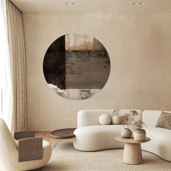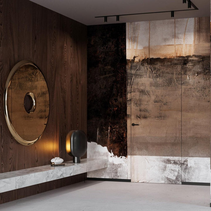 „Nux” to abstrakcyjna kompozycja o wyraźnie malarskim, niemal surowym charakterze. Wzór składa się z horyzontalnych pasów i prostokątnych płaszczyzn o zróżnicowanej fakturze – od miękkich, niemal kredowych przetarć, po gęste, ciemne warstwy przypominające spatynowany metal lub ziemistą glinę. Całość przywodzi na myśl strukturalne obrazy współczesnych artystów, łączących malarstwo z materią – zacierających granice między płótnem a przestrzenią. „Nux” balansuje pomiędzy gestem a kontrolą, przypadkowością a kompozycją – tworząc tło, które nie dominuje, ale buduje głęboki, spokojny klimat wnętrza. To wzór, który nie narzuca interpretacji – raczej zostawia miejsce na refleksję i emocjonalny odbiór.