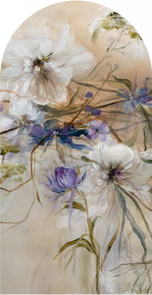 Tapeta „Violeta” to artystyczna opowieść o subtelnej sile natury. Wzór inspirowany jest letnią łąką o zmierzchu – rozświetloną złotym światłem i przesiąkniętą fioletem budzących się do życia kwiatów. Obraz utrzymany w duchu malarstwa impresjonistycznego, zachwyca miękkimi pociągnięciami pędzla i organicznym układem kompozycji. Białe, kremowe i lawendowe kwiaty delikatnie rozlewają się po płótnie w otoczeniu długich łodyg i dynamicznych, żywych linii, budując przestrzeń pełną emocji i lekkości.