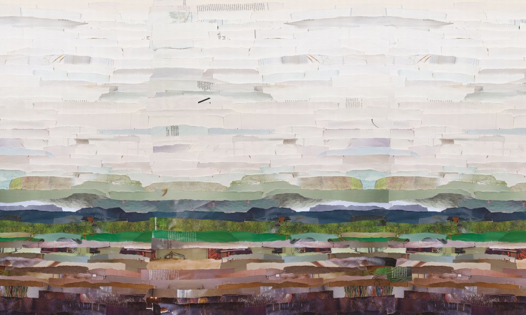 Tapeta „Arroz” to malarska interpretacja pejzażu wiejskiego, ukazana za pomocą unikalnej techniki kolażu z papieru. Setki ręcznie rwanego pasków tworzą wielowarstwowy obraz natury – pastelowe niebo, łagodne pasma gór, zieleń pól i faktury gleby, które łączą się w spokojną, niemal medytacyjną kompozycję. Wzór oddaje atmosferę spokoju, przestrzeni i ładu – niczym widok pól ryżowych rozciągających się po horyzont.