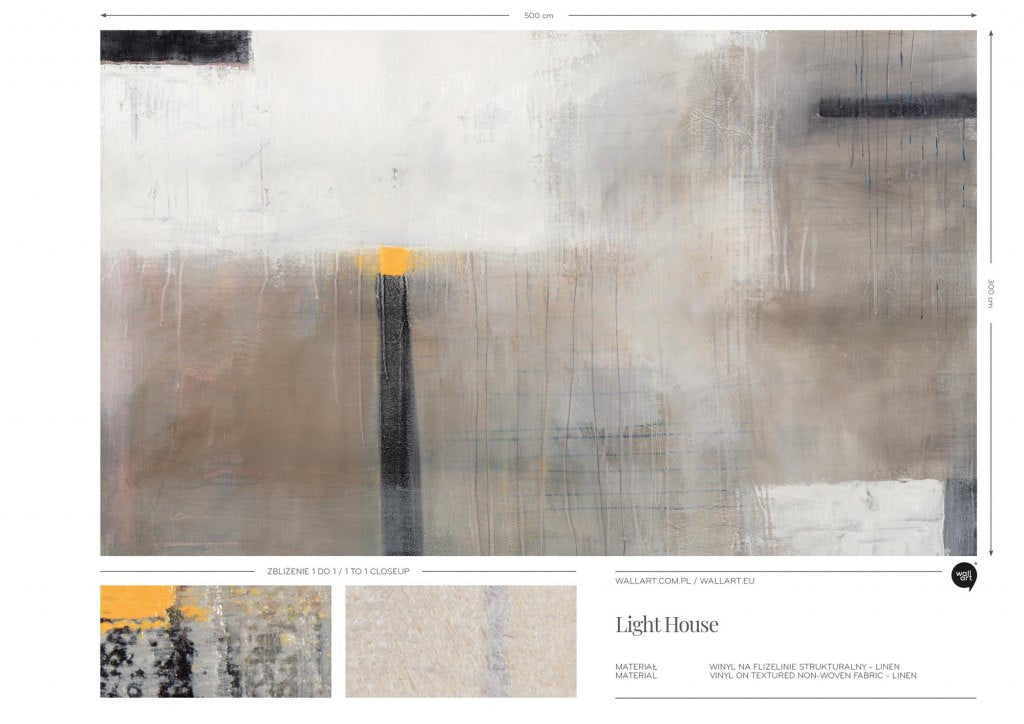 Light House to wyjątkowo elegancka w swym minimaliźmie kompozycja, utrzymaną w stonowanej palecie barw. Dominujące odcienie szarości, bieli i beżu, z jednym wyraźnym, żółtym akcentem, dają wrażenie harmonii, a dzięki delikatnym przejściom kolorystycznym i subtelnym detalom można zauważyć subtelne różnice tekstury i artystycznej nieregularności. Light House emanuje spokojem i elegancją, dzięki swojej prostocie i harmonijnemu układowi barw i kształtów. To wzór, który doskonale wpisze się w nowoczesne, minimalistyczne wnętrza, dodając im subtelnego wyrazu i klasy, ale jego neutralna kolorystyka sprawia, że jest bardzo uniwersalnym elementem dekoracyjnym, który może komponować się z różnymi stylami aranżacji wnętrz.