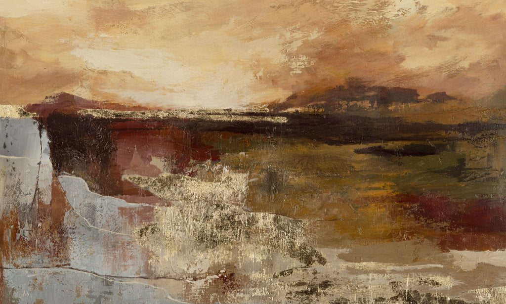 Paleta opiera się na zgaszonych odcieniach ochry – brązach – rudościach – beżach – srebrzystych szarościach oraz subtelnych złotych akcentach, które dodają całości elegancji i szlachetnego blasku. Ciepłe barwy wprowadzają harmonię do wnętrza, a chłodniejsze tony równoważą kompozycję, tworząc spokojny, nastrojowy efekt.