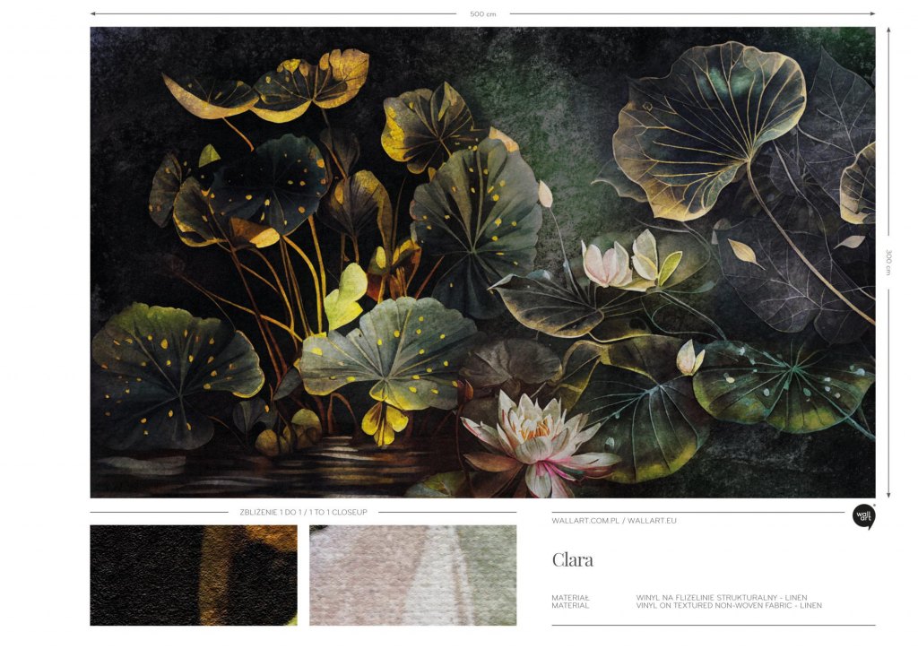 Clara to bajkowy wzór przedstawiający fantazyjny brzeg tajemniczego jeziora. Roślinność przedstawiona za pomocą głębokich, butelkowych zieleni skontrastowanych soczystą żółcią, sprawia wrażenie jakby oświetlało je ciepłe, magiczne światło. Tło ze strukturą kamienia dodatkowo podkreśla naturalny charakter wzoru.