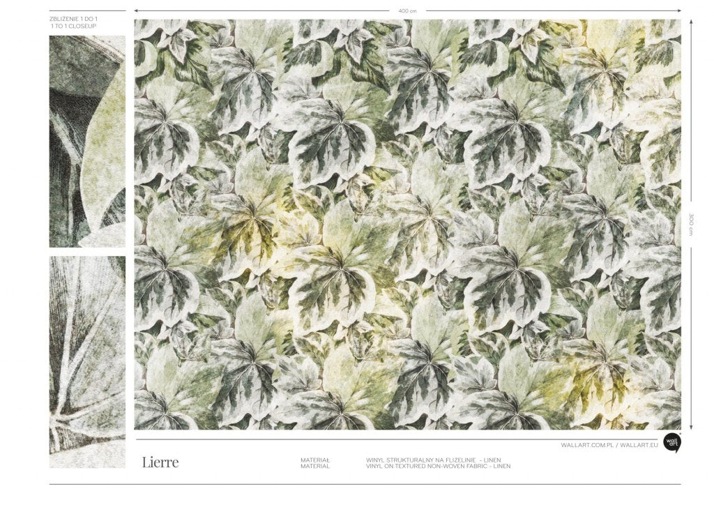 Lierre to wzór w kolekcji Nature. Duże zielono - żółte liście bluszczu na grafice udekorują ścianę niczym zielony żywopłot zaczarowany ogród. Tapeta nawiązuje do natury, wzór uspokaja, a jednocześnie jest bardzo oryginalny. Będzie pasował do salonu, kuchi, sypialni, łazienki czy biura.