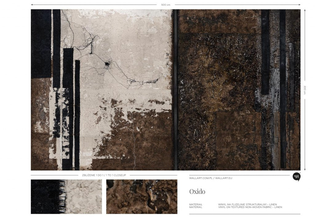 Paleta „Oxido” to połączenie intensywnych, rdzawych brązów, beżów i miedzianych tonów z kontrastującą czernią i off-white, które przywodzą na myśl rzeźbioną powierzchnię starego, zardzewiałego muru. Efekty patyny i przetarć wzmacniają wrażenie autentyczności i nadają kompozycji industrialnego charakteru.