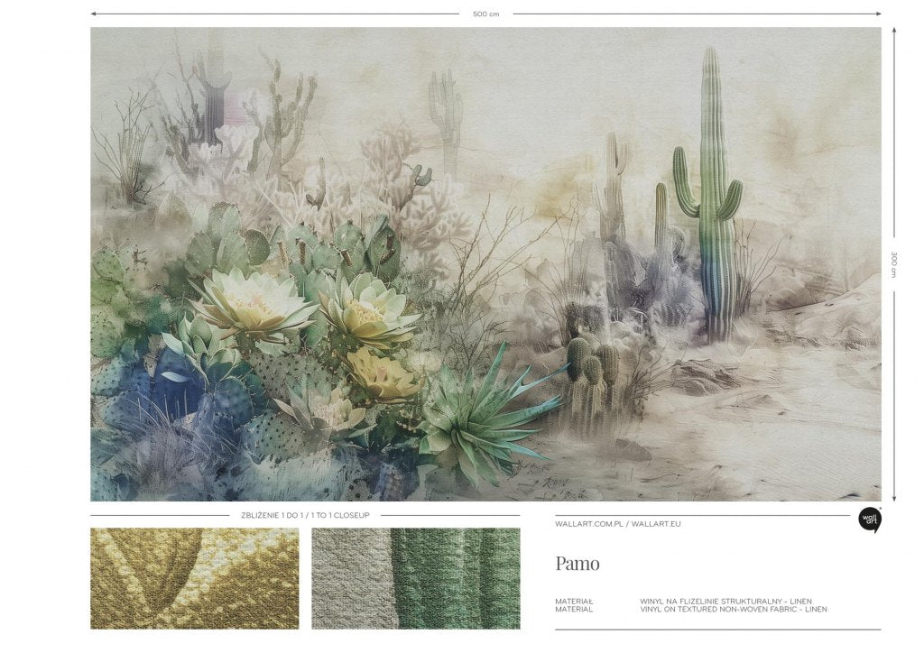 „Pamo” to subtelna podróż przez krajobraz pustyni, w której życie rozkwita mimo surowych warunków. Ilustracja przedstawia kompozycję pełną kaktusów, agaw i kwitnących opuncji, otulonych akwarelową mgłą i pastelowym światłem. Wzór zaskakuje lekkością i harmonią – to obraz natury, który koi zmysły i dodaje przestrzeniom organicznej głębi.