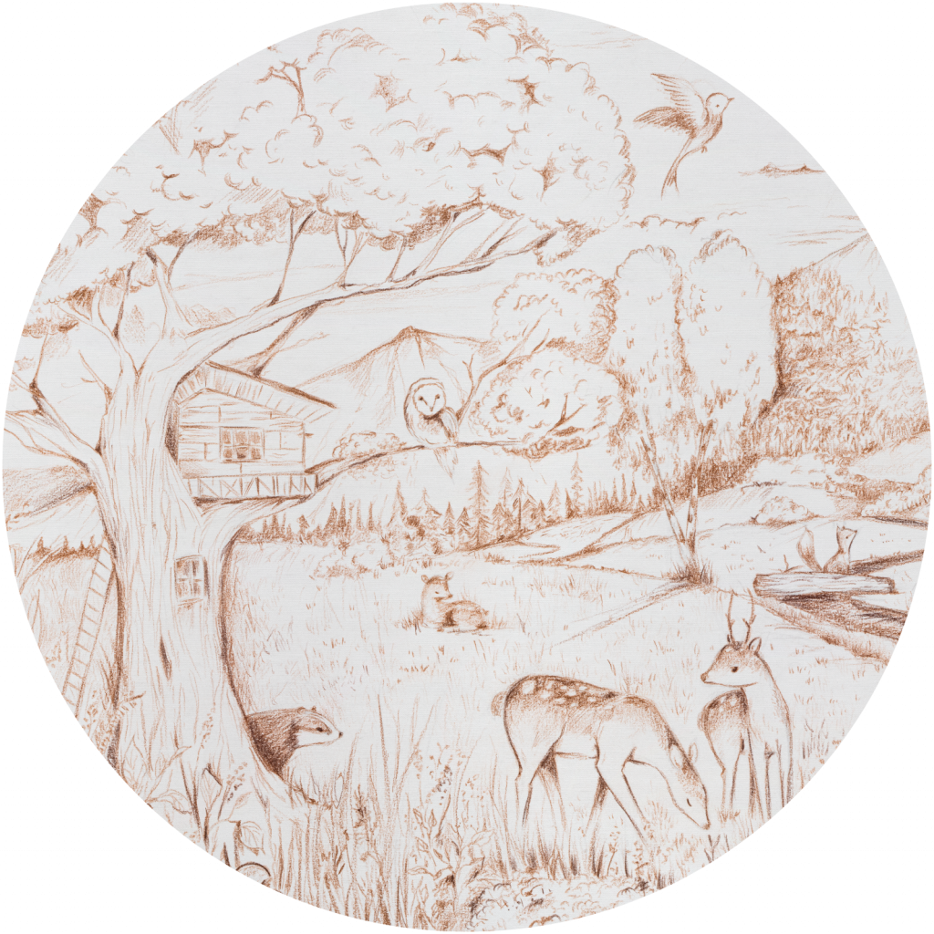 Elliot przedstawia idylliczną scenę leśną, pełną zwierząt i naturalnych elementów. Na pierwszym planie widoczne są sarny, zające, jeż i borsuk, a w tle widać dom na drzewie, strumyk, góry oraz ptaki na niebie. Całość utrzymana jest w delikatnych, pastelowych odcieniach brązu i beżu, co nadaje kompozycji nostalgicznego i sielankowego charakteru. Elliot to znakomity wybór do pokoju dziecięcego, tworząc ciepłą i przytulną atmosferę. Jego delikatne barwy i urocze przedstawienie leśnych zwierząt sprawią, że przestrzeń nabierze baśniowego klimatu, który z pewnością przypadnie do gustu najmłodszym. Można go umieścić nad łóżkiem, biurkiem lub w kąciku zabaw, gdzie będzie inspirować do zabawy i rozwijania wyobraźni.