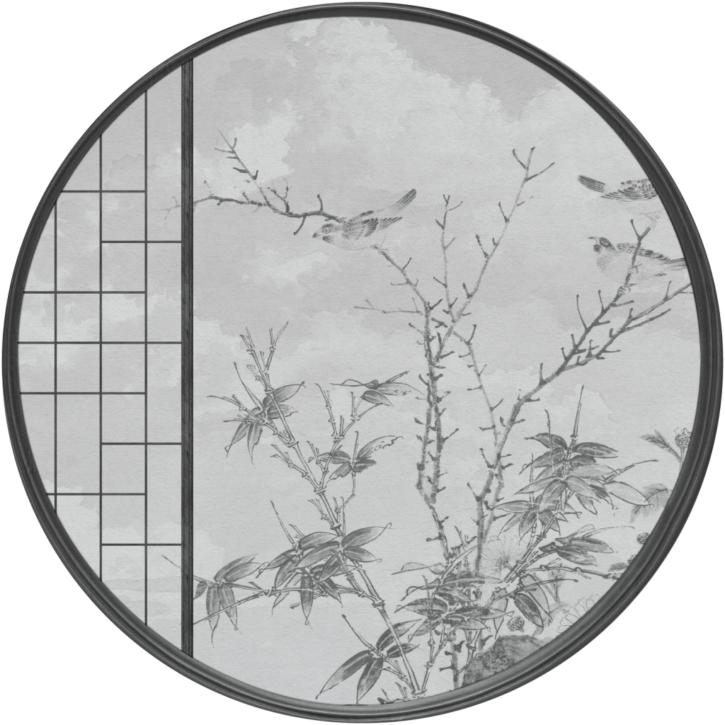 Gemini to wyjątkowa, odważna propozycja łącząca w sobie subtelność pejzażu z mocnymi, geometrycznymi elementami. Zdefiniowany podział wzoru sprawa, że w fenomenalny sposób możemy podzielić wizualnie wnętrze. Pionowe linie optycznie podwyższają pomieszczenie, natomiast sielski krajobraz zamknięty w okręgu sprawia wrażenie dodatkowego okna i również powiększa przestrzeń. Monochromatyczna kolorystyka gwarantuje nienachalną, nieco surową elegancję, złagodzoną delikatnym motywem gałązek i ptaków.