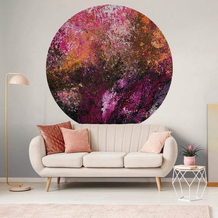 Nasze koła mają średnicę 130 cm i są drukowane na samoprzylepnym winylu o subtelnej strukturze płótna. To materiał, który prezentuje się lekko i elegancko, a jednocześnie jest zmywalny i trwały. Dzięki temu możesz je bez obaw stosować nie tylko na ścianie, ale również na meblach, drzwiach czy szkle – wszędzie tam, gdzie chcesz dodać wnętrzu charakteru.