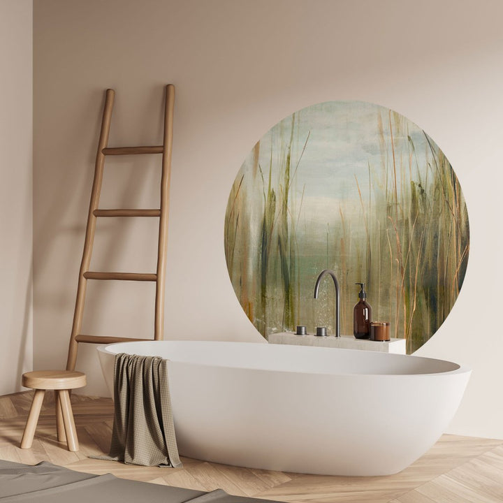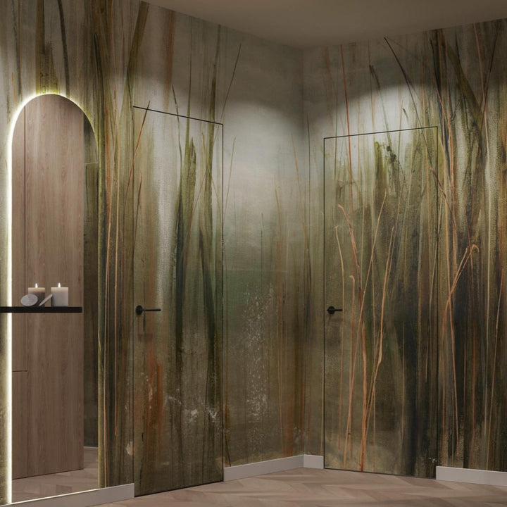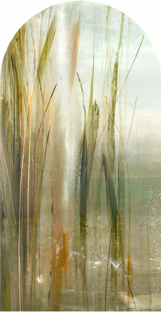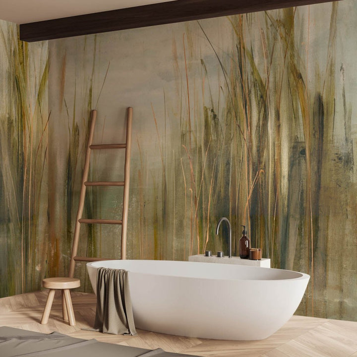 Tapeta „Canna” to wyjątkowy wzór inspirowany naturą – w szczególności wysokimi trawami, trzciną i roślinnością bagienną. Malarska kompozycja oddaje atmosferę spokojnego poranka nad wodą, gdzie rosa jeszcze lśni na źdźbłach, a wszystko spowite jest lekką mgłą i złotym światłem. Subtelne przejścia kolorystyczne i pionowy rytm roślin tworzą efekt kojącego pejzażu, który wprowadza do wnętrza oddech i ukojenie.