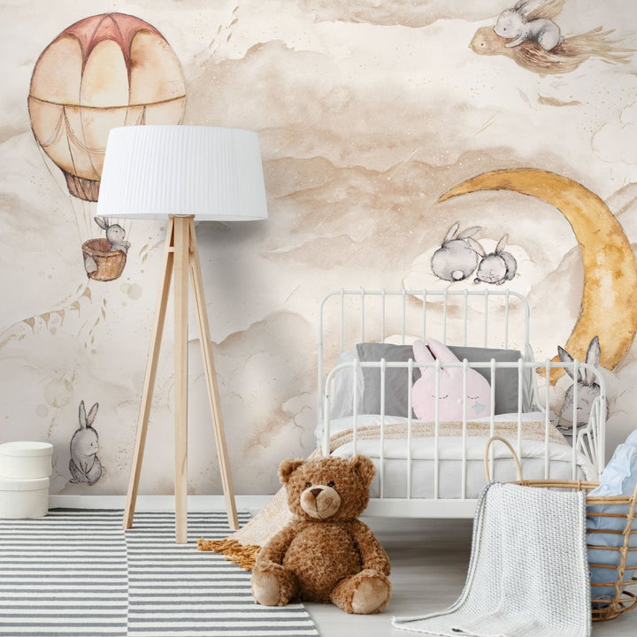 Obłoczki, śpiące króliczki i bajkowe krajobrazu zapraszają dzieci do krainy snu. Otwarta i lekka kompozycja wzoru przeniesie Ciebie i Twojego malucha do świata baśni, dając możliwości kreatywnej aranżacji wnętrza. Ciepłe, pastelowe odcienie beżu pozwolą na urządzenie pokoju dla dziecka w dowolnej kolorystyce. Idealnie wpasuje się w nowoczesne wnętrze lub urządzone w stylu naturalnym czy boho.