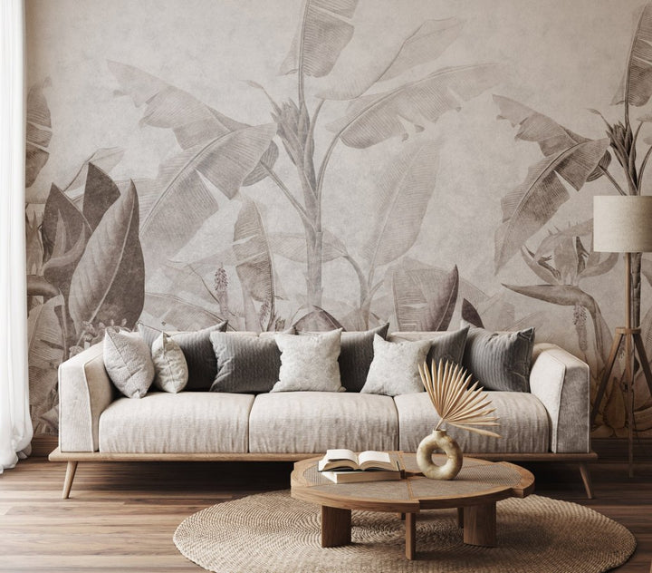 Tapeta Rainforest Beige to połączenie motywu tropikalnych liści z betonowym tlem. Idealne uzupełnienie aranżacji w małych wnętrzach, pasuje do stylu loftowego, minimalistycznego , nowoczesnego skandynawskiego.