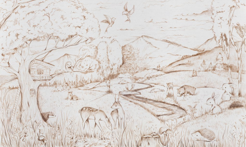 Elliot przedstawia idylliczną scenę leśną, pełną zwierząt i naturalnych elementów. Na pierwszym planie widoczne są sarny, zające, jeż i borsuk, a w tle widać dom na drzewie, strumyk, góry oraz ptaki na niebie. Całość utrzymana jest w delikatnych, pastelowych odcieniach brązu i beżu, co nadaje kompozycji nostalgicznego i sielankowego charakteru. Elliot to znakomity wybór do pokoju dziecięcego, tworząc ciepłą i przytulną atmosferę. Jego delikatne barwy i urocze przedstawienie leśnych zwierząt sprawią, że przestrzeń nabierze baśniowego klimatu, który z pewnością przypadnie do gustu najmłodszym. Można go umieścić nad łóżkiem, biurkiem lub w kąciku zabaw, gdzie będzie inspirować do zabawy i rozwijania wyobraźni.