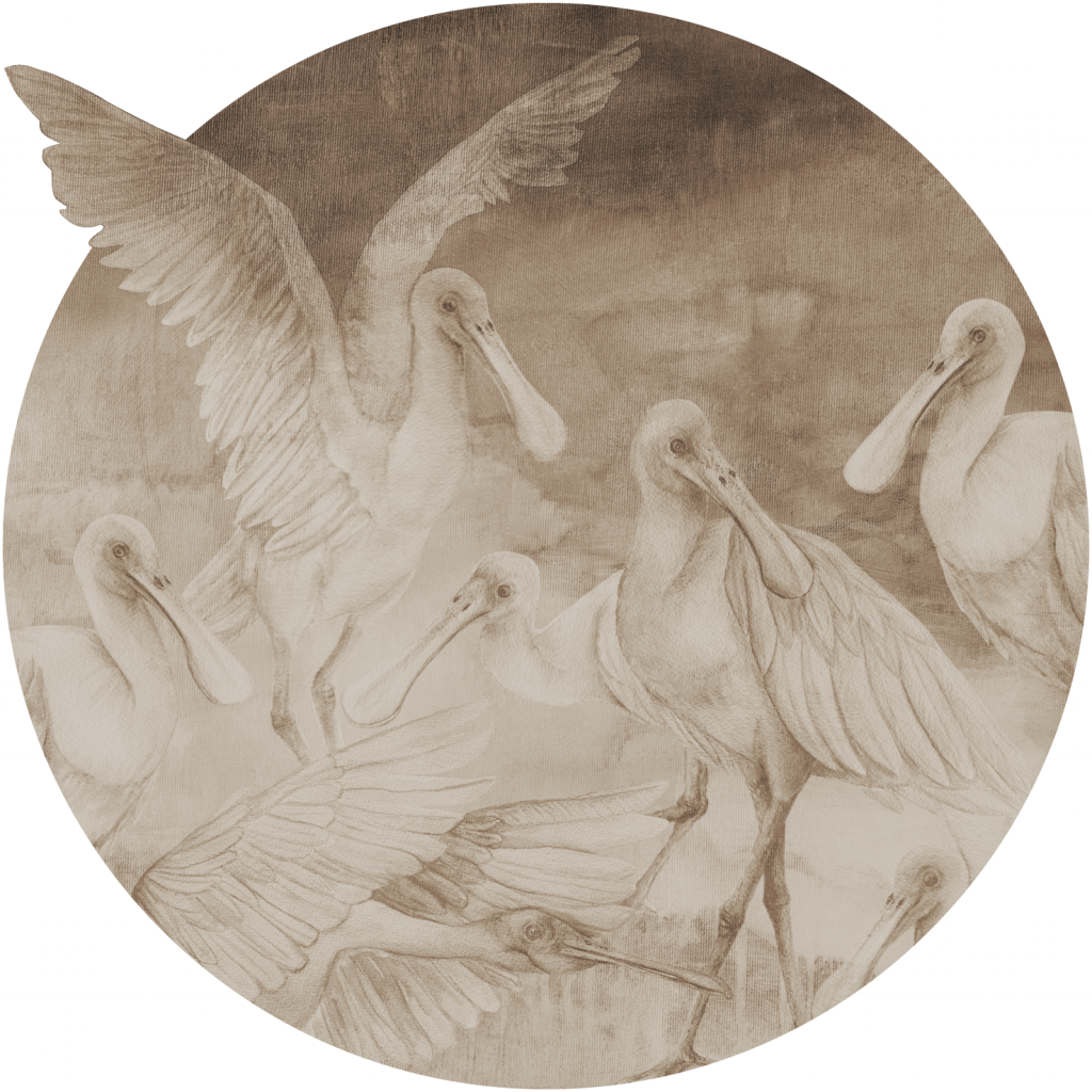Ajaja Beige obrazuje urocze stado warzęch różowych, których łacińska nazwa to Platalea ajaja. Każda warzęcha została narysowana ręcznie z wyjątkową dbałością o szczegóły. Brązy, beże i odcienie złamanej bieli zastosowane we wzorze sprawiają, że jest on bardzo uniwersalny, stonowany i będzie stanowił nienachalną ozdobę większości ścian.