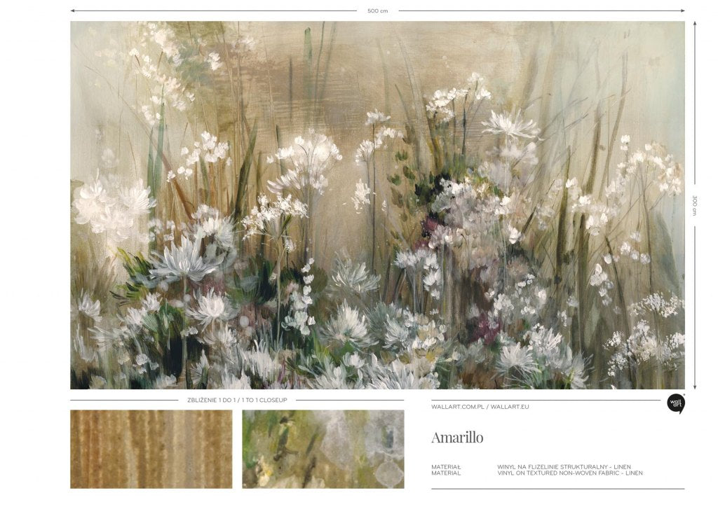 Tapeta „Amarillo” to malarska interpretacja letniej łąki – pełnej światła, delikatnych roślin i impresjonistycznych pociągnięć pędzla. Ten wzór oddaje esencję natury uchwyconej w spokojnej, złotej godzinie – subtelnie rozświetlonej, miękkiej i pełnej życia. Kwiaty i trawy wydają się tańczyć w ciepłym powietrzu, a całość tworzy harmonijną kompozycję z pogranicza snu i rzeczywistości.