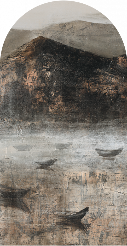 „Barca” to impresyjny pejzaż malarski przedstawiający spokojną taflę wody, po której dryfują drobne łodzie rybackie, a w tle wyłaniają się monumentalne, zamglone masywy górskie. Obraz oddaje wrażenie surowego, północnego poranka – jakby uchwycono moment ciszy przed świtem lub tuż po zmierzchu. Kompozycja jest pełna tekstur: od szorstkich, niemal fakturalnych pociągnięć pędzla, przez subtelne przejścia tonalne, aż po refleksy na wodzie, tworzące efekt delikatnego światła odbijającego się od powierzchni. Łodzie zostały ukazane w półcieniu – jak cienie zakotwiczone w przestrzeni, co nadaje wzorowi medytacyjny charakter. Ten wzór działa niemal jak obraz – opowiada historię, buduje nastrój i skłania do zatrzymania się na chwilę.