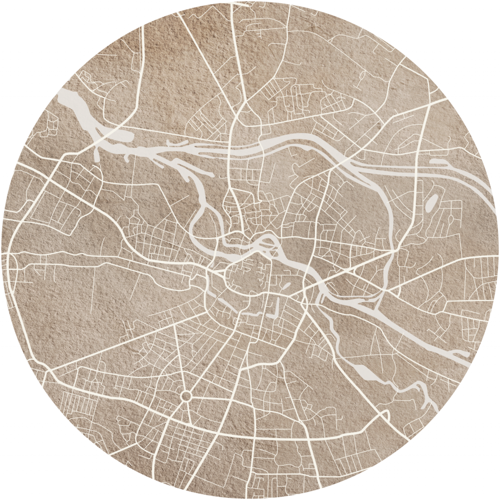Breslau to grafika przedstawiająca plan miasta Wrocław, ukazując urbanistyczny układ miasta. Na pierwszym planie widoczna jest gęsta sieć ulic, alei i dróg, które tworzą skomplikowany wzór łączący różne części miasta. Najbardziej charakterystycznym punktem na planie jest Stare Miasto, zaznaczone wyraźnie w centrum. Breslau, dzięki zastosowaniu ograniczonej liczby kolorów jest bardzo nowoczesnym wzorem idealnym do biur, restauracji czy innych przestrzeni użyteczności publicznej.