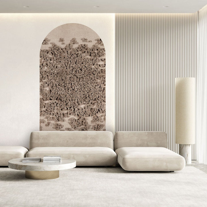 Dominują delikatne, neutralne tony piaskowego beżu i ciepłego brązu. Kolorystyka jest ziemista i naturalna, a jednocześnie elegancka – nadaje wnętrzom spokojny, uziemiający charakter. Efekt cienia i faktury wzmacnia wrażenie głębi.