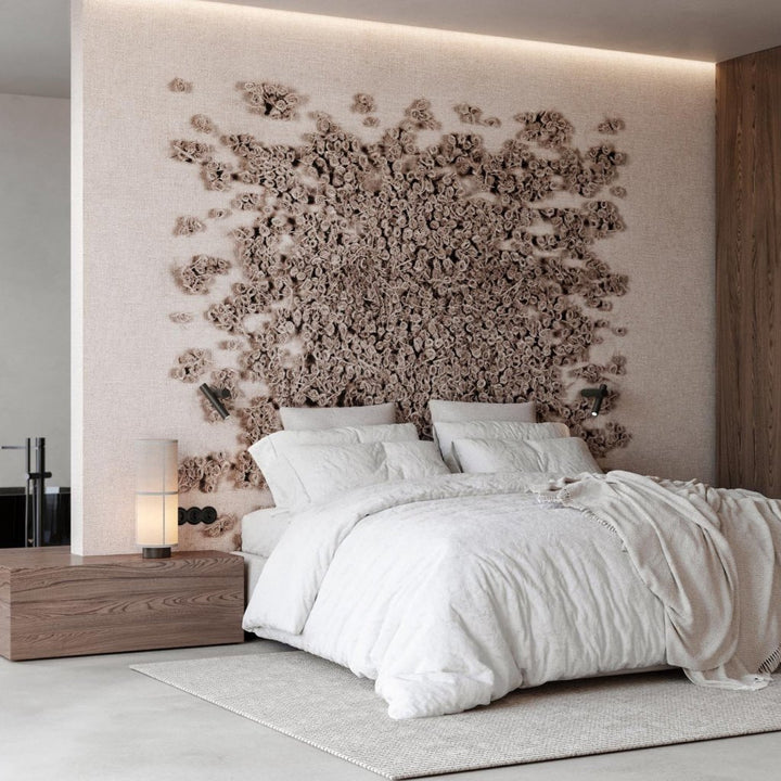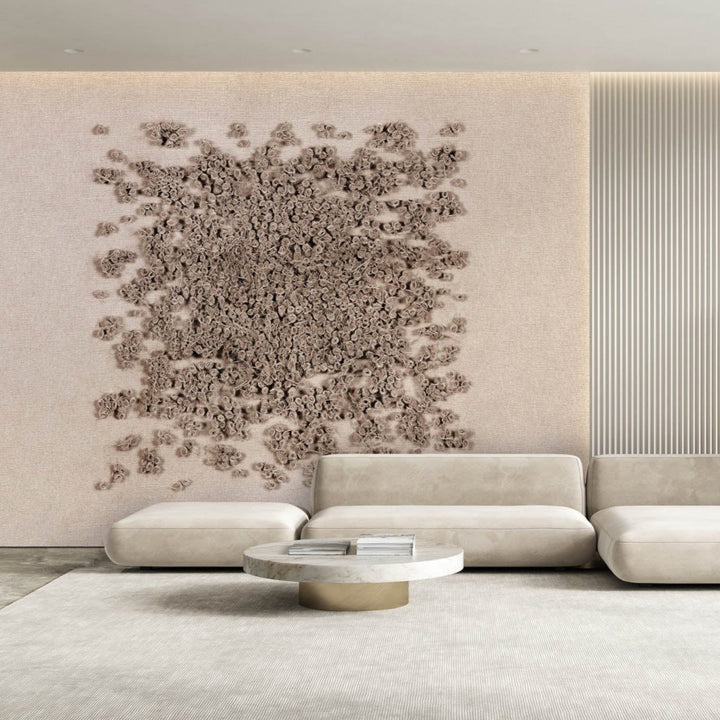 „Centro” to wzór o organicznej strukturze i geometrycznym skupieniu, który przyciąga uwagę swoją rzeźbiarską formą. Kompozycja przypomina skupisko tysięcy drobnych, zrolowanych elementów – jakby wykonanych z miękkiej tkaniny, kory lub papieru czerpanego – ułożonych w nieregularną, lecz zwartą formę w centrum pola. Kształty rozmywają się i przenikają w otaczającą je przestrzeń, tworząc wrażenie naturalnej ewolucji formy: od gęstości do ulotności. Ta gra światła i cienia sprawia, że powierzchnia wydaje się niemal trójwymiarowa. „Centro” opowiada o skupieniu i rozproszeniu, o centrum, z którego rozchodzi się pulsująca energia – interpretacja może być zarówno symboliczna, jak i czysto dekoracyjna.