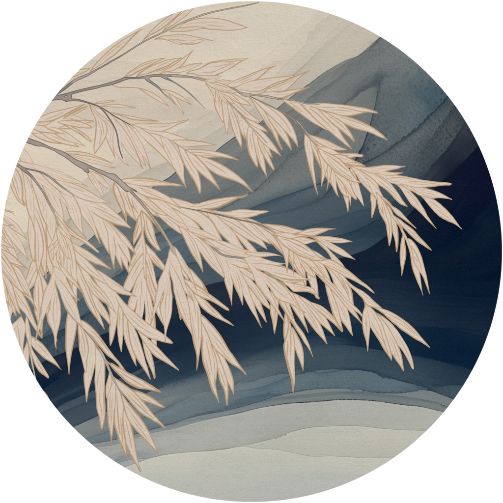 Tapeta „Dalila” to delikatna opowieść o harmonii między linią a formą. Głównym motywem jest finezyjnie rysowana gałąź z drobnymi liśćmi, która łagodnie opada na tło przypominające abstrakcyjne fale lub kontury gór. Kompozycja jest zbalansowana, spokojna i niezwykle elegancka – niczym kadr z japońskiej księgi botanicznej.