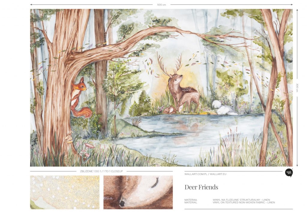 Leśna polana, pełna barwnych detali, małych leśnych zwierzątek z królem lasu - jeleniem na czele. Ciepłe, barwne kolory wzoru pozwolą na zaaranżowanie pokoju dla dziecka w każdym kolorze. Idealnie wpasuje się w nowoczesne wnętrze lub urządzone w stylu naturalnym czy boho.