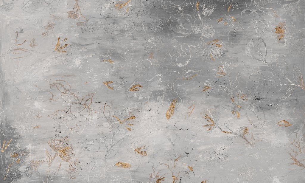 Grati - połączenie ciężkiego motywu betonu z delikatnymi wydrapanymi motywami kwiatowymi oraz delikatne przetarcia w kolorach złota. Wzór w stylu wabi - sabi idealnie wpisujący się we współczesne trendy mówiące o pięknie rzeczy nieidealnych i niedokończonych.