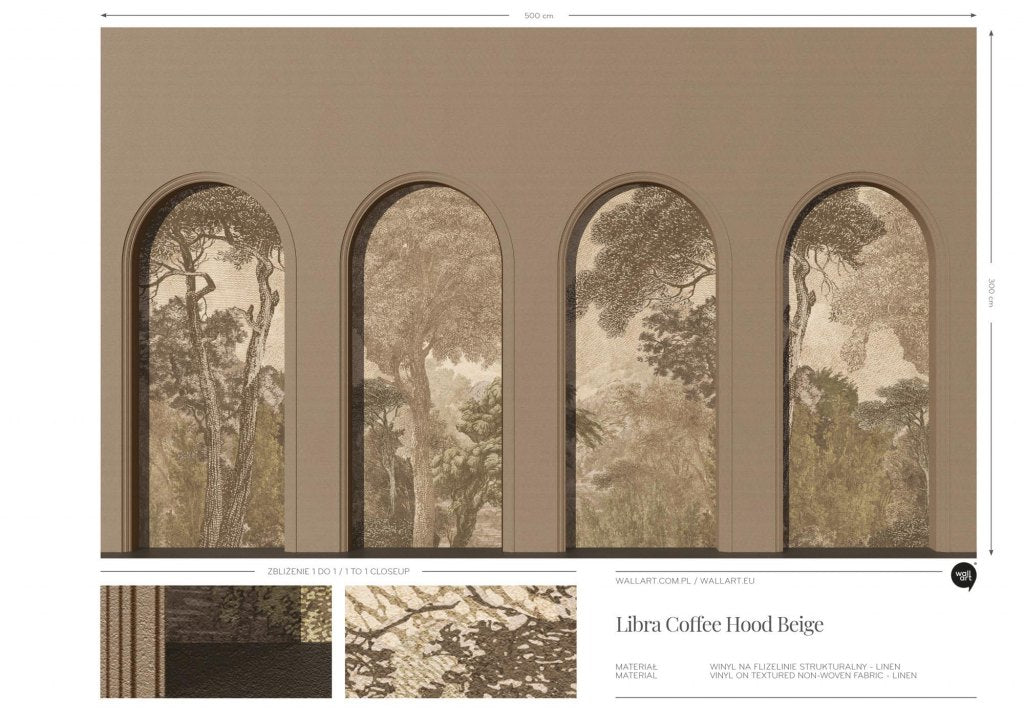 Wnętrze łuków to wzór Hood Light, który wprowadzi do wnętrza las w niezwykle eleganckim, nieco kolonialnym wydaniu. Widok nawiązujących do starych rycin przedstawia dziki, niezbrukany ludzką ręką starodrzew. Ciepłe zielenie i tło lekko stylizowane na stare ryciny, będą idealnym uzupełnieniem zarówno drewnianych mebli jak i przełamaniem nowoczesnych beży. Perspektywa uchwycona w pejzażu sprawi, że wnętrze nabierze głębi i optycznie się powiększy.