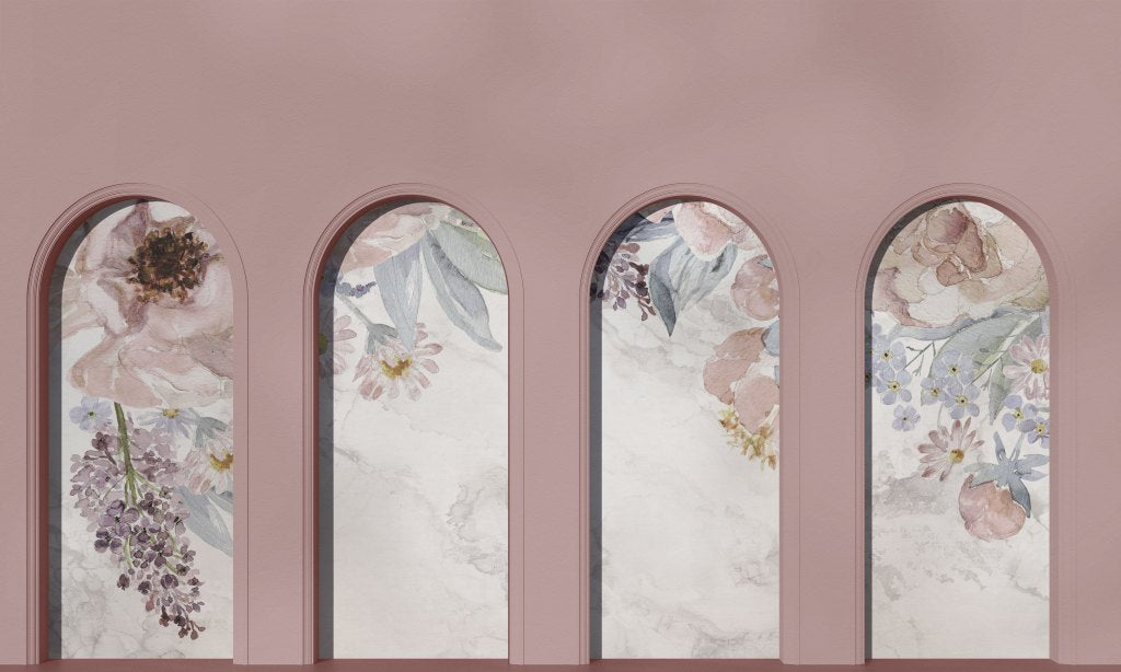 Nettare to ręcznie malowany bukiet, przepięknych kwiatów: peonii, zawilców i bzów. Delikatne motywy roślinne schowane za różowymi łukami dodadzą pomieszczeniu lekkości i romantyzmu.