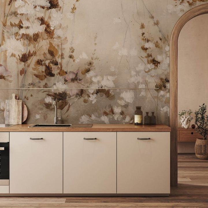 Tapeta „Marron” to propozycja dla miłośników subtelnej elegancji i ciepłych, przytulnych tonów. Inspirowana naturalnym pięknem suszonych kwiatów i jesiennej roślinności, zachwyca malarską formą oraz miękkim, rozproszonym światłem, jakby uchwyconym tuż przed zachodem słońca. Kwiaty i liście – w bieli, karmelu, miedzi i odcieniach brązu – układają się w poetycką, nieco nostalgiczną kompozycję o spokojnym rytmie i lekkiej dynamice.