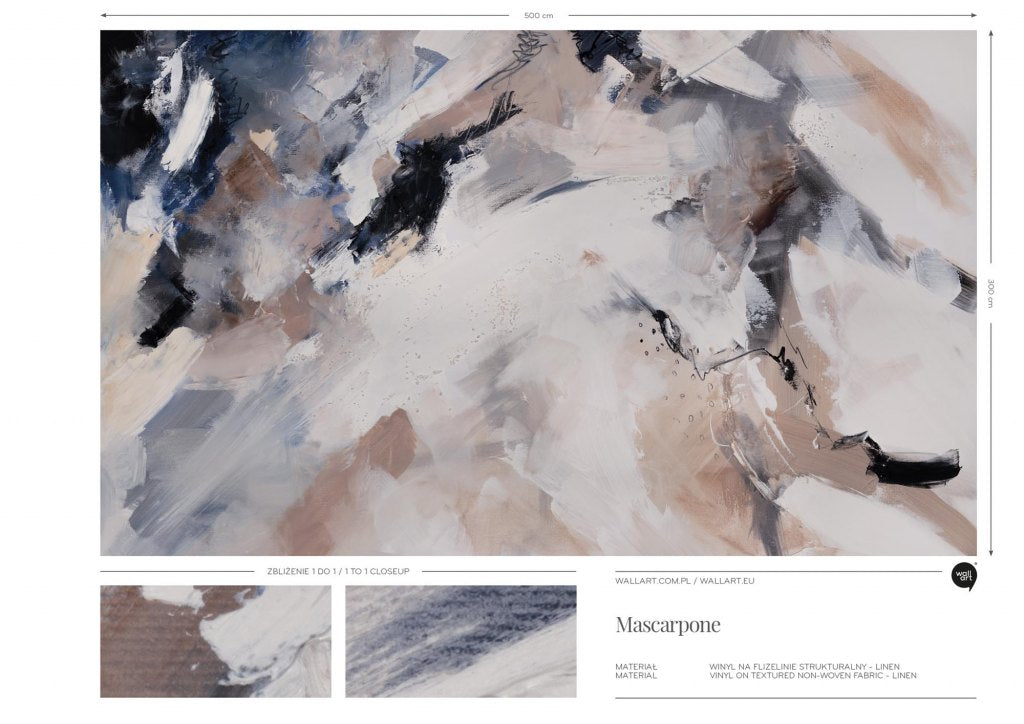 Mascarpone to nieoczywisty, abstrakcyjny wzór z dynamicznymi pociągnięciami pędzla, w odcieniach bieli, szarości, beżu i czerni, z delikatnymi akcentami niebieskiego. Malarska technika i różnorodność barw tworzą wrażenie ruchu i głębi, co sprawia, że obraz jest zarówno nowoczesny, jak i wyrazisty. Mascarpone idealnie nadaje się do minimalistycznych, nowoczesnych przestrzeni, gdzie może pełnić rolę centralnego punktu dekoracyjnego. Jego neutralna paleta kolorów sprawia, że łatwo komponuje się z innymi elementami wystroju, takimi jak meble w odcieniach bieli, szarości i naturalnego drewna. Dzięki swojej dynamicznej formie, obraz ten może ożywić i dodać charakteru zarówno salonowi, sypialni, jak i przestrzeni biurowej.Abstrakcyjny styl wzoru nadaje się do wnętrz, które wymagają eleganckiego, lecz nienachalnego akcentu artystycznego. Może być idealnym tłem dla nowoczesnych, prostych mebli, podkreślając ich linie i formy. Dodatkowo, obecność delikatnych odcieni beżu i niebieskiego może harmonizować z naturalnymi teksturami, takimi jak wełna, len czy drewno, tworząc ciepłą i przytulną atmosferę.