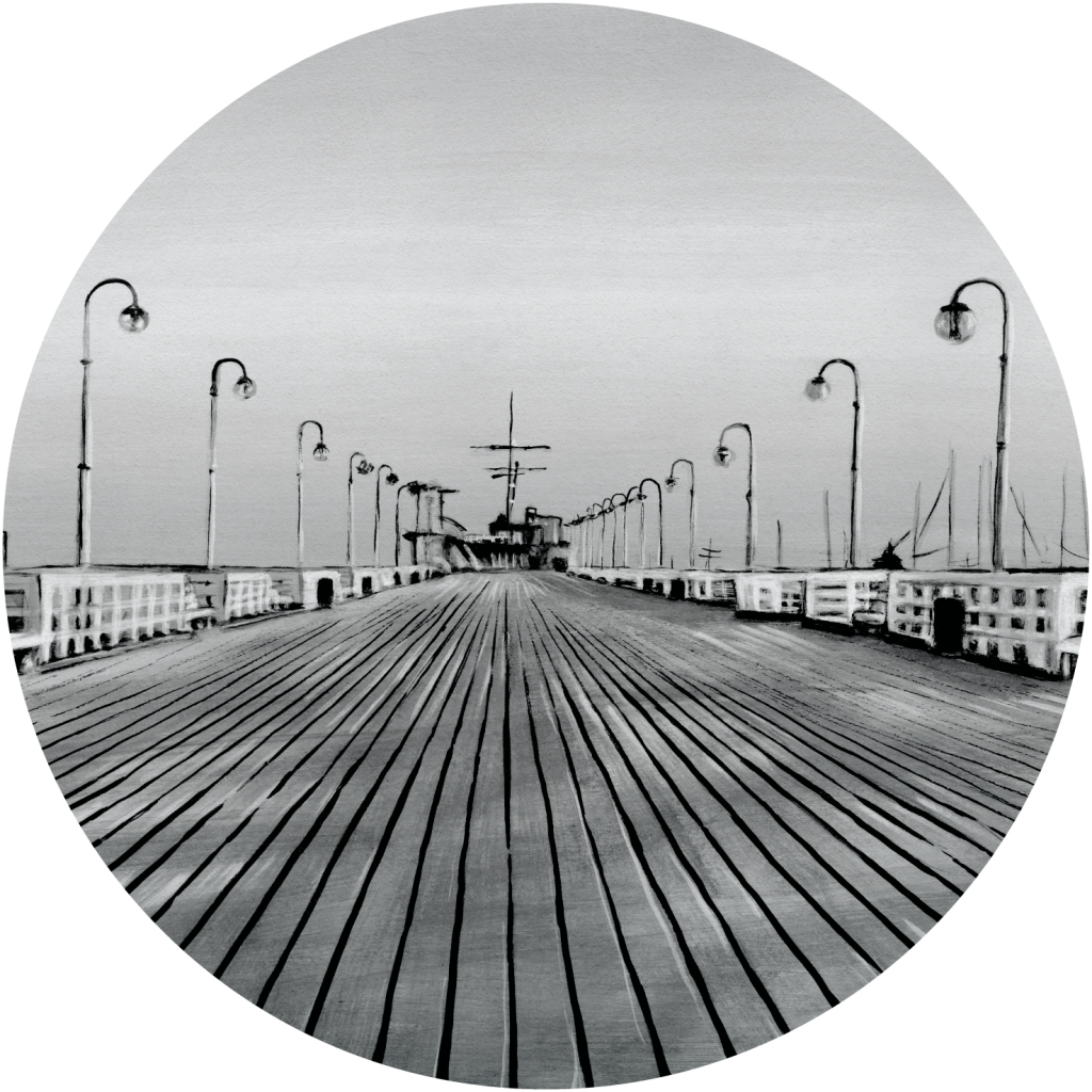 Molo to czarno-biała grafika przedstawiająca wizytówkę Sopotu.Symetryczne lampy uliczne oraz drewniane deski molo prowadzą wzrok w kierunku centrum wzoru, gdzie widać zarys statku. Molo świetnie sprawdzi się w nowoczesnym salonie, dodając mu minimalistycznego, a jednocześnie wyrafinowanego charakteru. Może być również doskonałym uzupełnieniem wnętrz w stylu marynistycznym lub skandynawskim, gdzie stonowane kolory i proste linie są kluczowe. Grafika ta, dzięki swojej monochromatycznej kolorystyce, może harmonijnie komponować się z różnorodnymi paletami barw w pomieszczeniu, w tym stanowić interesujący kontrast w bardziej kolorowych wnętrzach, nadając im wyrafinowanego akcentu i podkreślając elegancję całej aranżacji.