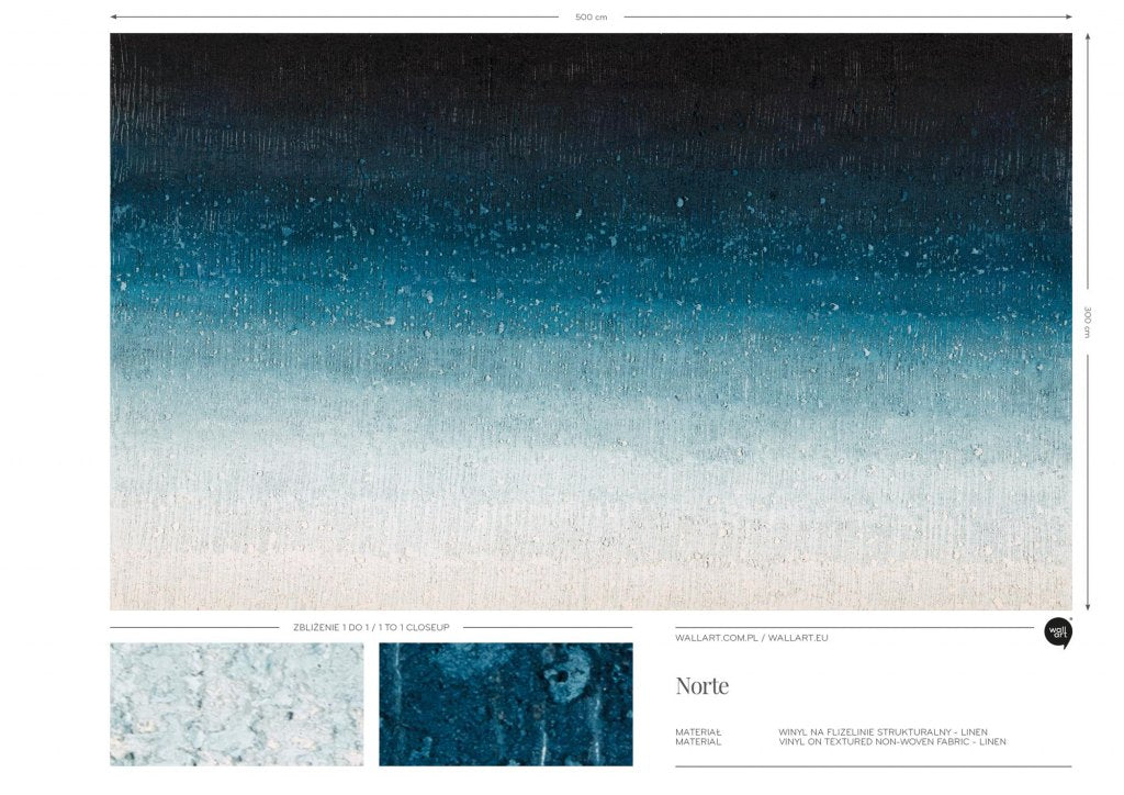 Norte to wzór, który wyróżnia się subtelnym gradientem, przechodzącym od jasnych, kremowych tonów u góry do ciemniejszych odcieni niebieskiego i granatu w dolnej części. Tekstura na obrazie dodaje wrażenie głębi i złożoności, dzięki delikatnym kroplom farby i pionowym liniom, które przypominają krople deszczu. Norte idelanie sprawdzi się w przestrzeniach utrzymanych w minimalistycznym lub nowoczesnym stylu. Jego neutralne kolory łatwo komponują się z innymi elementami wnętrza, dodając mu spokoju i elegancji. W sypialni jego delikatne przejścia kolorystyczne mogą sprzyjać relaksowi i wyciszeniu, w gabinecie może działać inspirująco, jednocześnie nie rozpraszając, dzięki swojej spokojnej palecie barw i subtelnej teksturze. Norte to wzór idealnie pasuje do wnętrz, które stawiają na harmonię, minimalizm i elegancję.