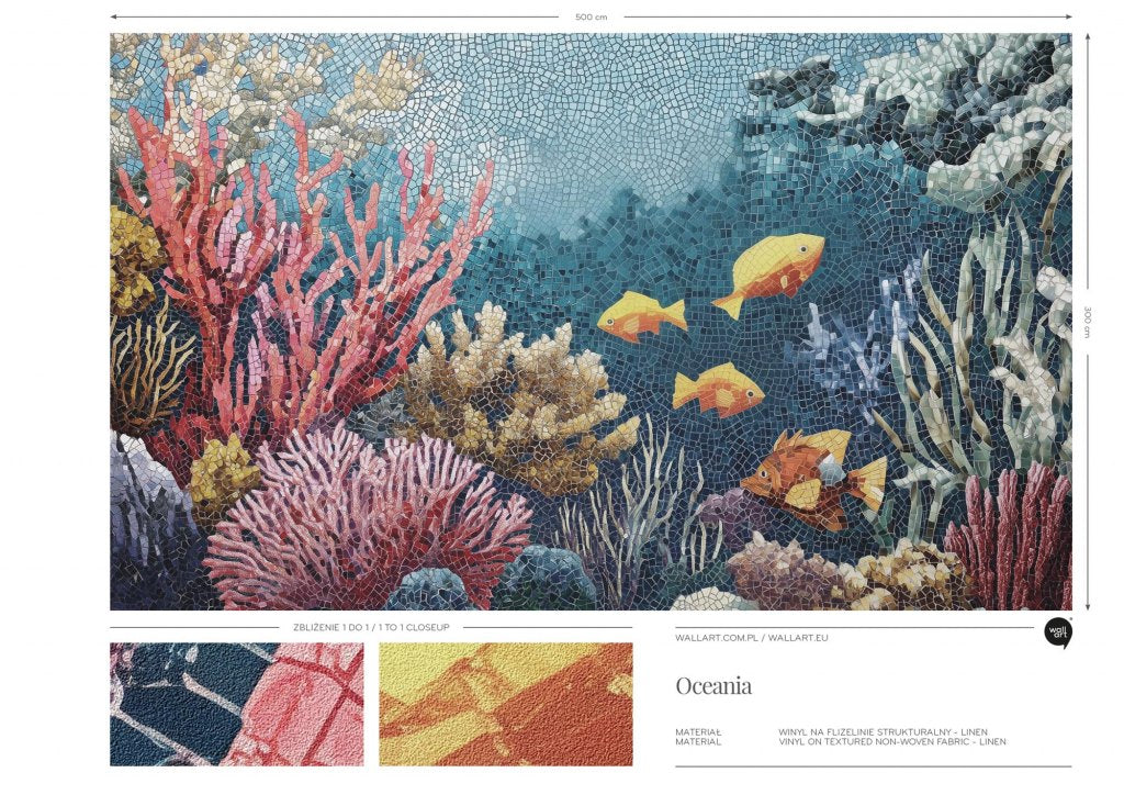 Tapeta „Oceania” to artystyczna podróż w głąb podwodnego świata – mozaikowa kompozycja tętniąca kolorem, życiem i energią oceanu. Motyw inspirowany jest rafą koralową i jej mieszkańcami – misternie ukazane ryby, koralowce i roślinność tworzą barwny, dynamiczny pejzaż morski. Struktura przypominająca ceramiczną mozaikę nadaje wzorowi oryginalny, rękodzielniczy charakter i wyrazistą fakturę, przywołując skojarzenia z włoską lub hiszpańską tradycją dekoracyjną.