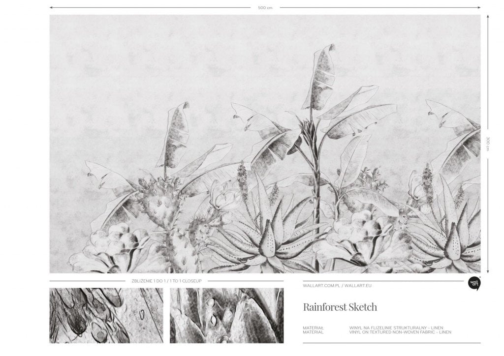 Tapeta Rainforest Sketch to połączenie motywu tropikalnych liści z betonowym tlem. Idealne uzupełnienie aranżacji w małych wnętrzach, pasuje do stylu loftowego, minimalistycznego , nowoczesnego skandynawskiego.