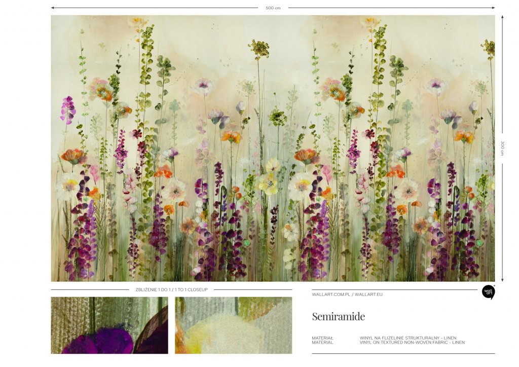 Semiramide to element mini kolekcji kwiatowej przedstawiającej kwietne łąki. Wzory powstałe na bazie obrazów namalowanych farbami akrylowymi, dzięki zastosowanej metodzie, są wyjątkowo bogate w efektowne detale.