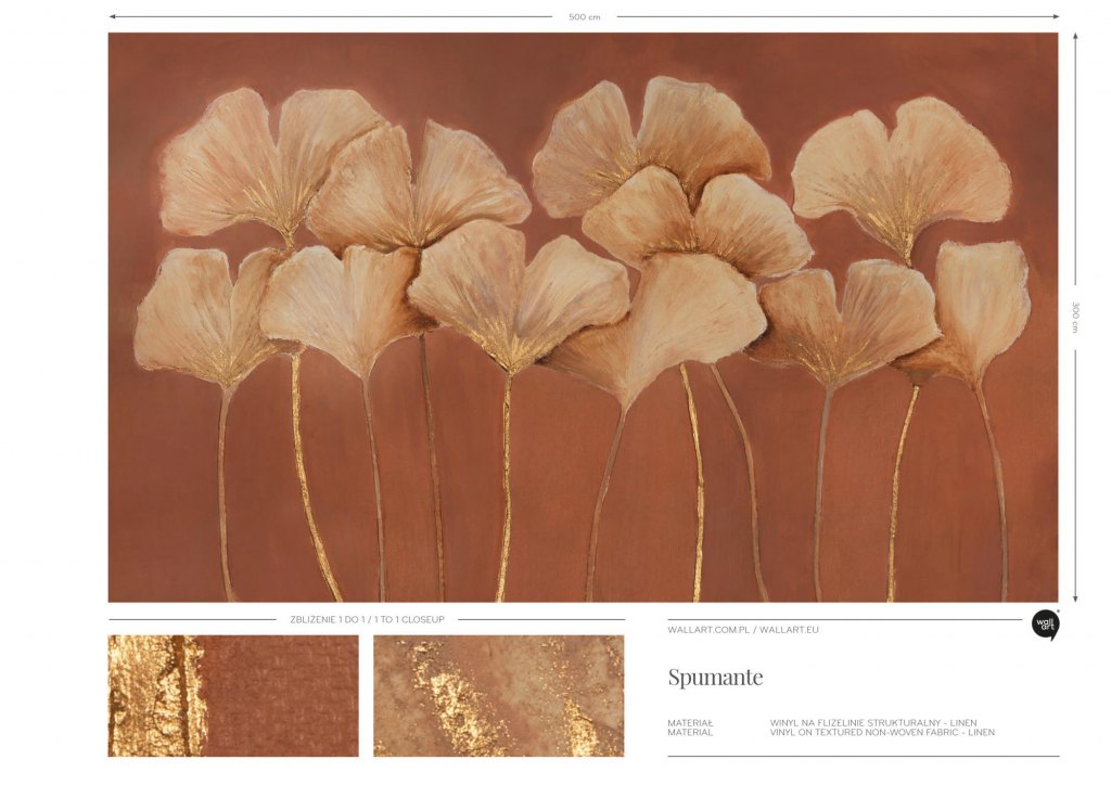 Spumante niczym prawdziwy szampan jest niepowtarzalny, ekskluzywny, a jednocześnie bardzo uniwersalny w odbiorze. Ręcznie malowany miłorząb japoński z delikatnymi złotymi zdobieniami doda splendoru każdemu pomieszczeniu. Umieszczenie roślin na tle w kolorze bardzo modnej, a jednocześnie ponadczasowej terracotty dodaje pomieszczeniu ciepła i elegancji. Badanie nad szampanem potwierdzają, że jego konsumpcja poprawia pamięć przestrzenną, z kolei Spumante poprawi każdą przestrzeń w naszym domu.