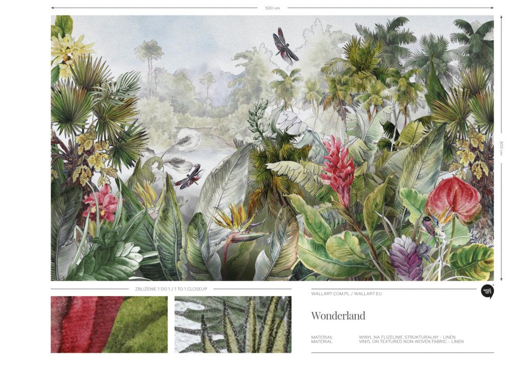 Wonderland czyli Kraina Czarów przedstawia prawdziwie magiczny pejzaż, łączący nasyconą zieleń z kolorowymi, egzotycznymi kwiatami. Tym razem nie jest to wyłącznie tropikalny las, a całe dorzecze magicznej, podzwrotnikowej krainy. Połączenie różnych technik malarskich w jednym obrazie daje baśniowy klimat i niczym wciągająca opowieść, odkrywa kolejne warstwy fantastycznej roślinności. Nasycone barwy sprawiają, że Wonderland z powodzeniem stanie się centralnym punktem pomieszczenia. Kraina Czarów będzie idealnym wyborem zarówno do pokoju dziecięcego, jak i salonu czy sypialni, w których chcemy uzyskać tropikalny klimat.